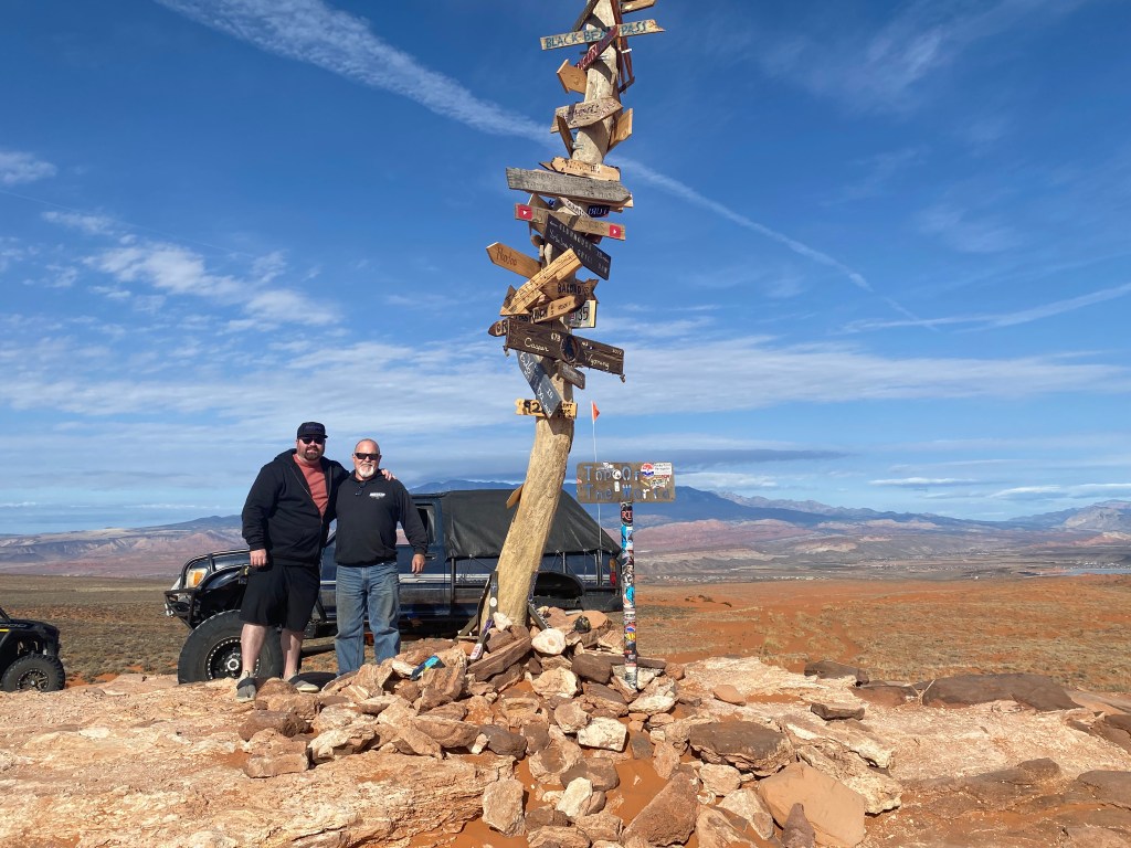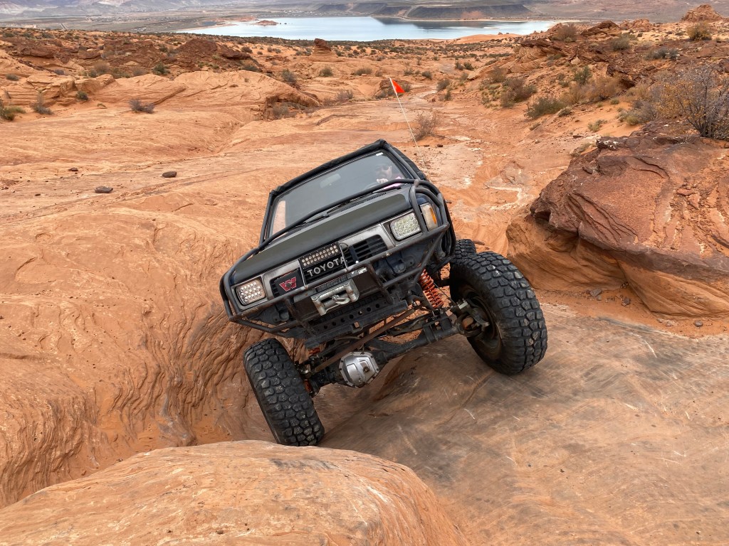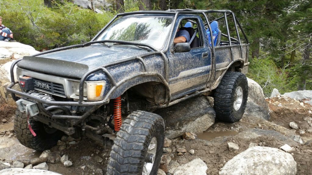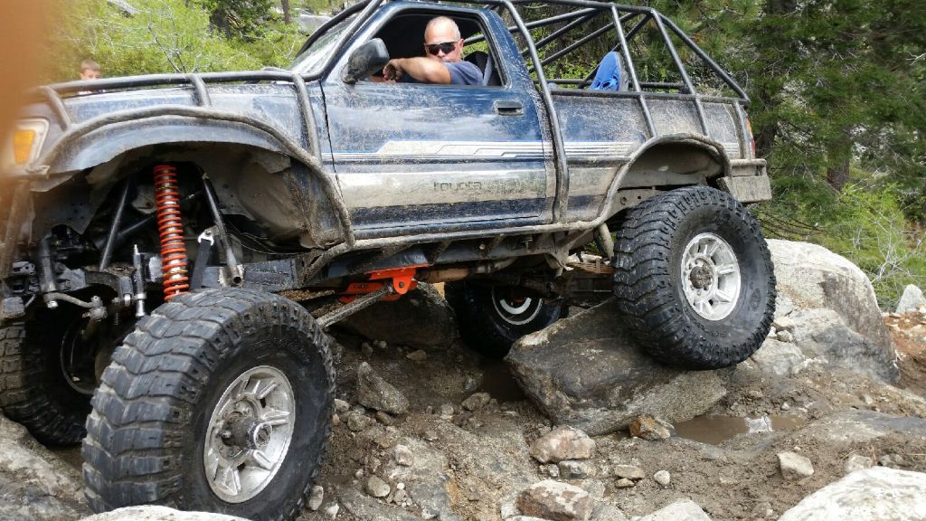 I kept breaking axles. So, I installed a GMD60 front and a 14 bolt rear with air lockers. I installed a second transfer case. I Went with H2 wheels and 40″ tires, I installed a 3 Link front kit from 4wheel Underground. I also built a full exocage for the first time. I cut 14″ out of the bed. I cut a walk through for added seats for the kids. I wheeled on a few trails like Fordyce and the Rubicon. I switched back to 37″ tires in 2020, due to the high price of new 40″ tires. Then I went to new places with my son. We visited Sand Hollow and King Of The Hammers. We also explored more of the Rubicon until late 2023.